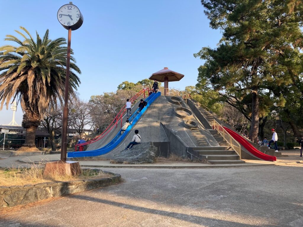 岡公園と言えば岩山、巨大滑り台の遊具、その他遊具少々、汽車と路面電車の屋外展示、茶室など、様々なものがある公園です。そして近年では城下町時代の遺構である門が公園敷地内に移転されるなど、総合公園としての様相が加速しています。